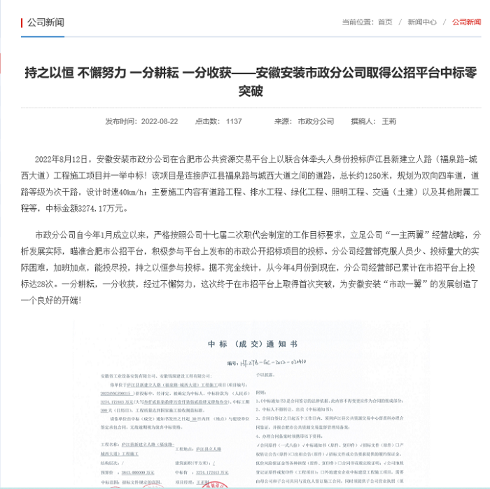 開(kāi)拓市場(chǎng)取得突破。今年以來(lái),分公司積極采取參與集團(tuán)內(nèi)部產(chǎn)業(yè)鏈專(zhuān)業(yè)分包競(jìng)標(biāo)和外部公招項(xiàng)目投標(biāo)雙向并舉的方式拓展市場(chǎng),打開(kāi)經(jīng)營(yíng)局面,連續(xù)承接了蜀山區(qū)體育公園項(xiàng)目安裝工程等多個(gè)項(xiàng)目。同時(shí)積極參與合肥市公招平臺(tái)投標(biāo),8月份一舉中標(biāo)廬江縣新建立人路(福泉路-城西大道)工程施工項(xiàng)目,中標(biāo)金額3274.17萬(wàn)元,取得公招投標(biāo)零的突破。